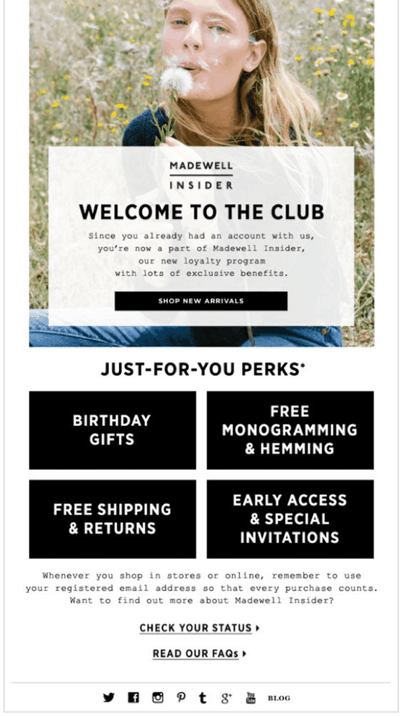 In the example below, clothing brand Madewell uses one email to introduce the programme, outline membership benefits and give the member an opportunity to learn more.