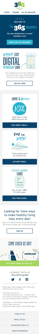 This is especially important for loyalty and rewards programs. Whole Foods, for example, has a series of welcome emails for newcomers to their My 365 Rewards programme.