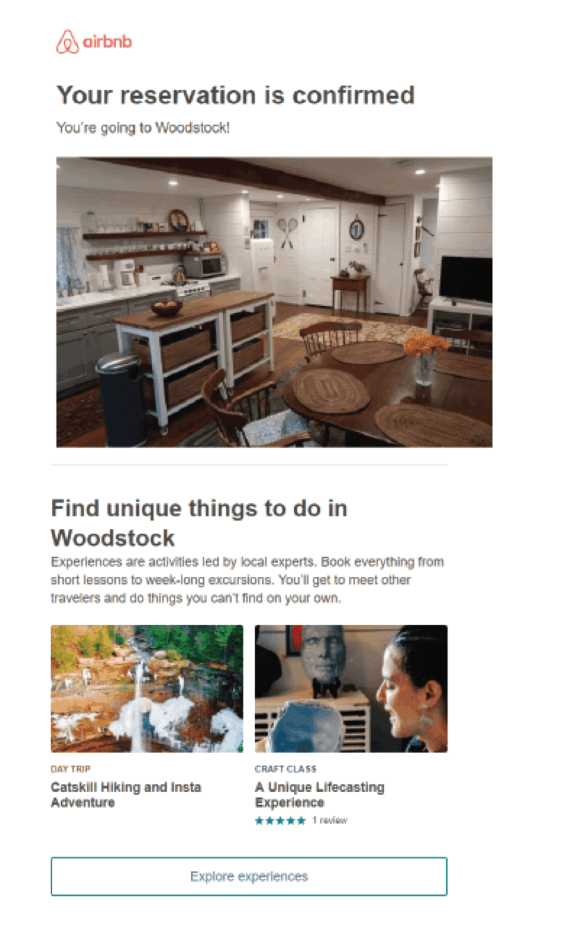 For example, when Airbnb sends a confirmation email, they tend to include a section to book fun activities in the area, like local hiking or crafting classes. These offers are highly relevant since people are often looking for unique adventures at their destination.
