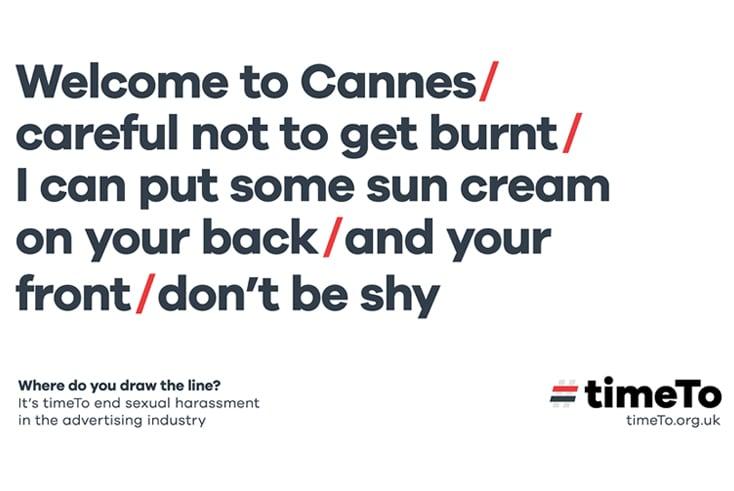 Arguably the world’s biggest creative communications festival, Cannes Lions will be held in the French Riviera town next week. Over the five days, attendees will hear the industry’s best and brightest speak messages of creativity, innovation, and this year, inappropriate and harmful behaviour. timeTo, an initiative created by industry bodies NABS, WACL, and the Advertising Association, is working to end sexual harassment in the industry. This year, they’re taking their "Where Do You Draw The Line?" campaign to Cannes. Created by London agency, Lucky Generals, the campaign will be made visible to festival goers using a mix of OOH, online, and an impactful short film created by Steve Reeves. timeTo will be addressing the situations and scenarios in which this harassment can occur.