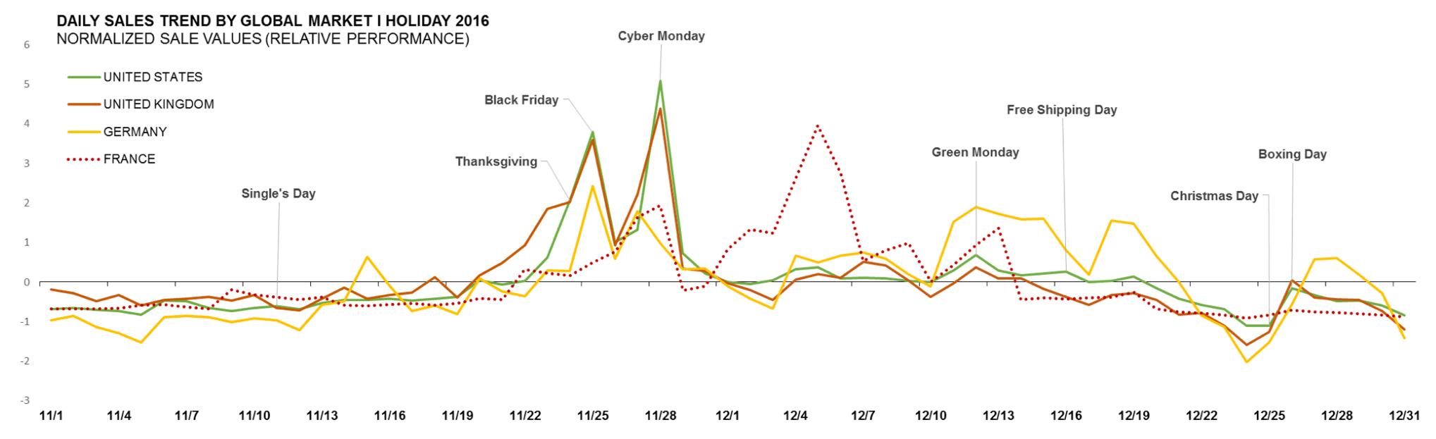 In France, different to all other markets, Cyber Monday and the following week were the peak periods for holiday shopping, as shown in the graph below.