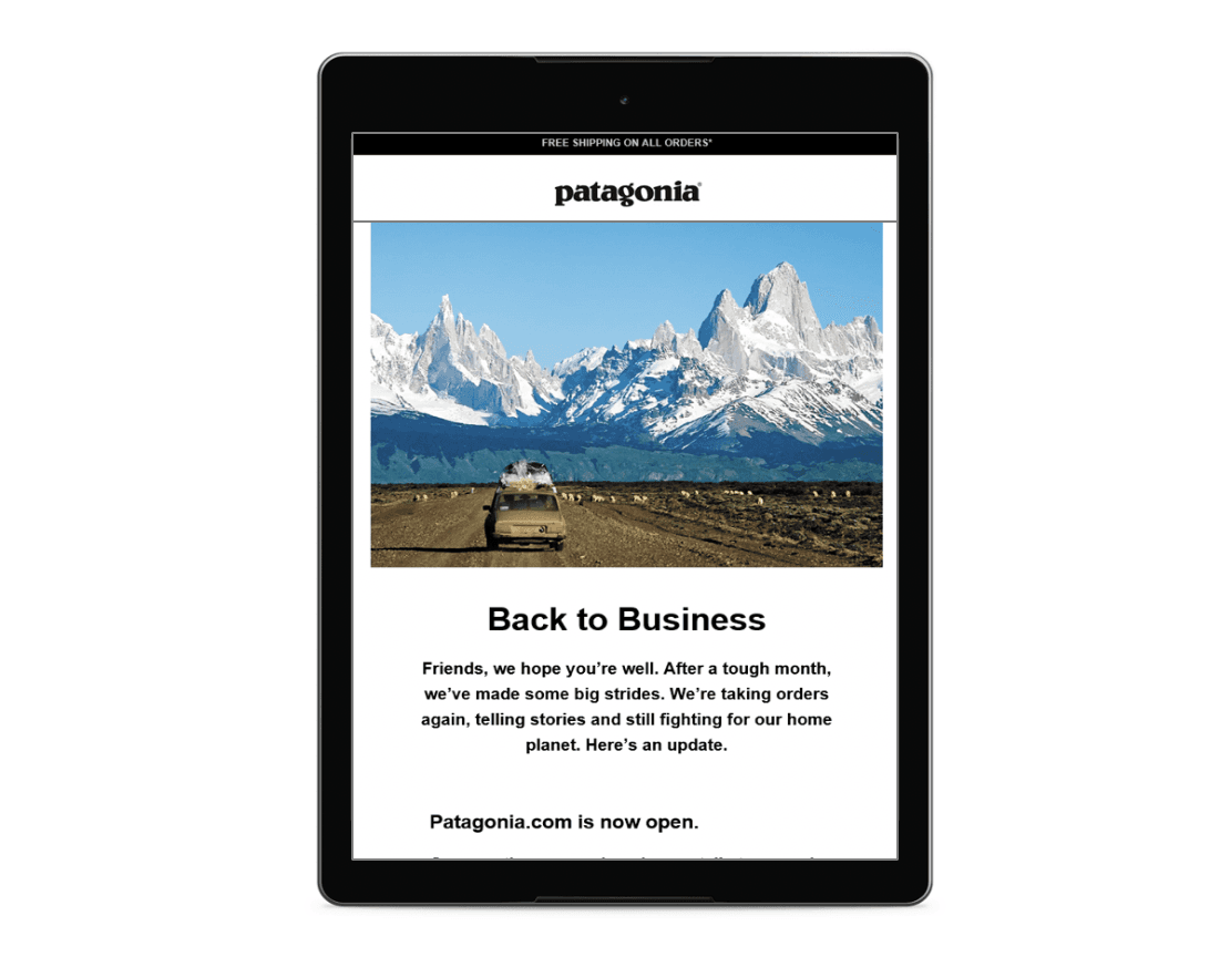 Patagonia took a unique tact as they prepared for the rebound with a .com reopening announcement. This email linked to a COVID-19 update where, they restated values that align with pandemic social conscious, which synced with their overarching brand mission: buy local, repair over new and avoid consumerism.