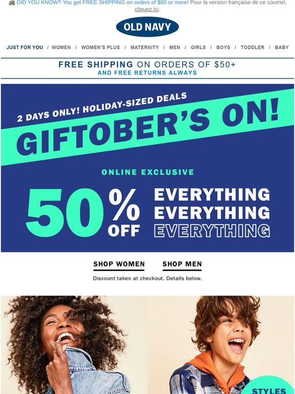 Old Navy: Yes, it’s officially GIFTOBER + you snagged FIFTY PERCENT off everything!