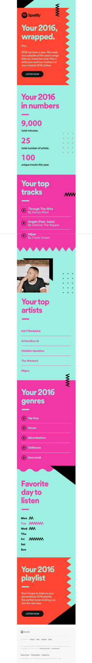 A well known example; Spotify sends an end-of-year recap to show members what they listened to over the past year, top tracks and artists and more. They then offer even more value with a personalised and unique playlist based on the members' listening behavior.
