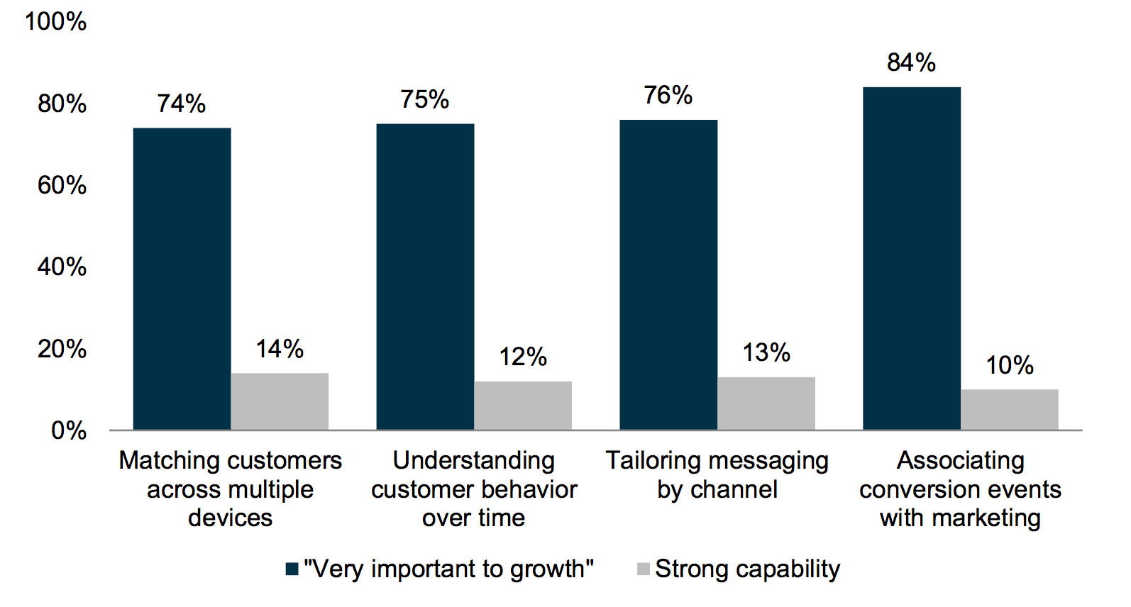 Of four key organisational capabilities needed for true personalisation, only between 10% and 14% of executives highlight existing strong capability. Yet at least 74% of the senior executives feel each one is paramount to future growth.