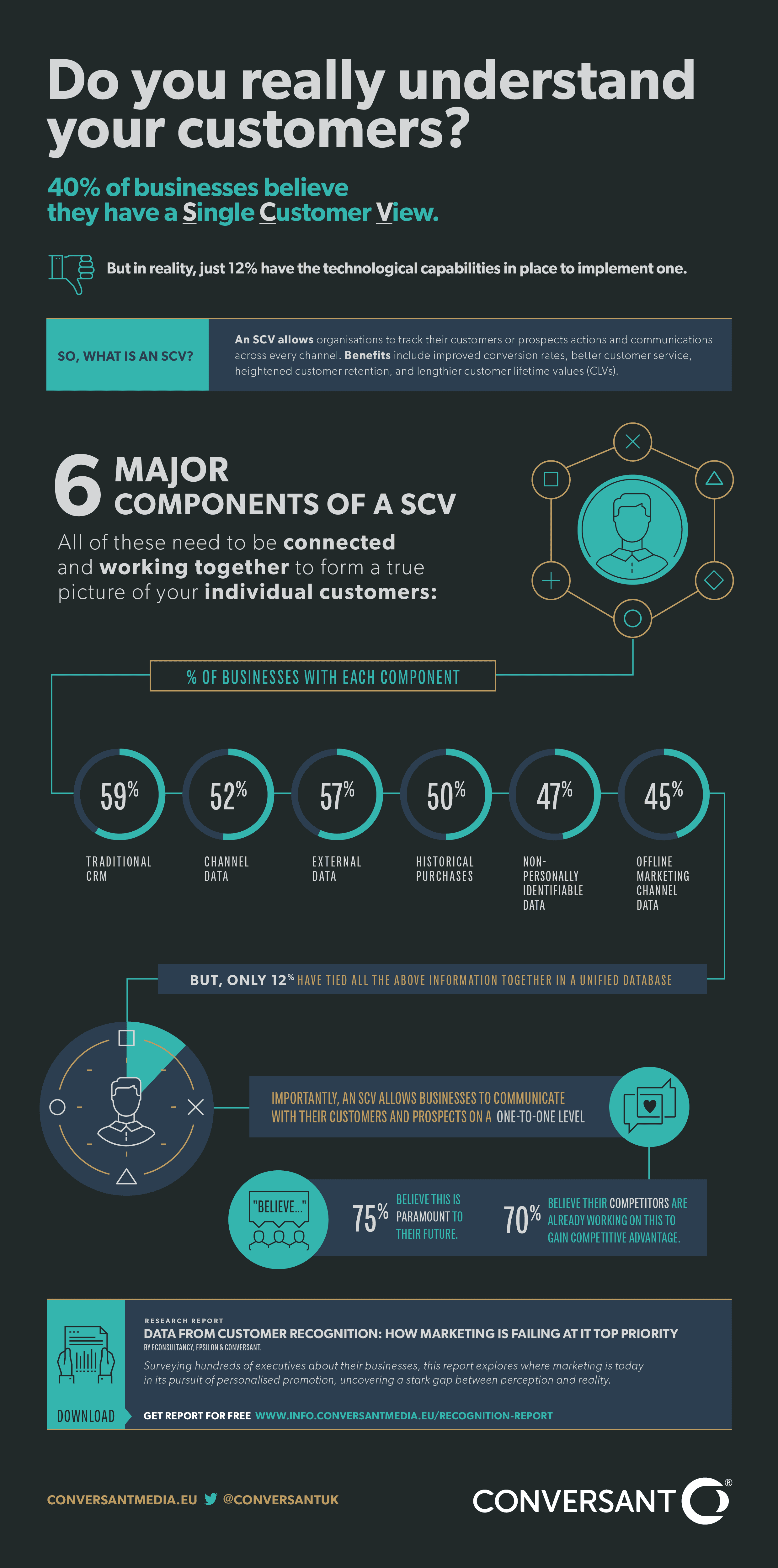 “Over 40% of large organisations report having a system for data unification in place,” says the report. “But when that number is reverse-engineered based on the integration of specific sources such as CRM, channel data and behavioural data, the number with a true single customer view (SCV) drops to only 12%."