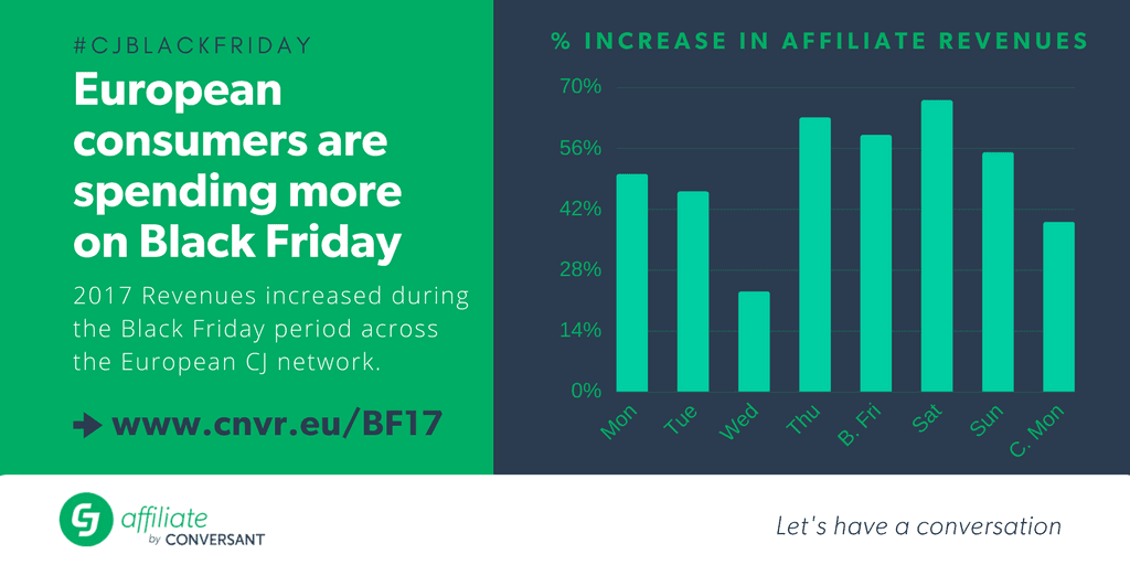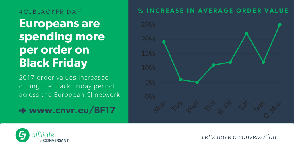 Across Europe, early data from CJ Affiliate shows that the 2017 Black Friday period has been stronger than ever, with revenue increasing by over 50%, orders by one-third, and average order value by 15%.