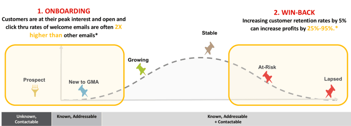 The pushpins in the customer journey map above identify all the potential phases of a start-stop brand relationship. Onboarding and Win-Back have been highlighted to identify the portions of the relationship that often provide the most significant value to map out.