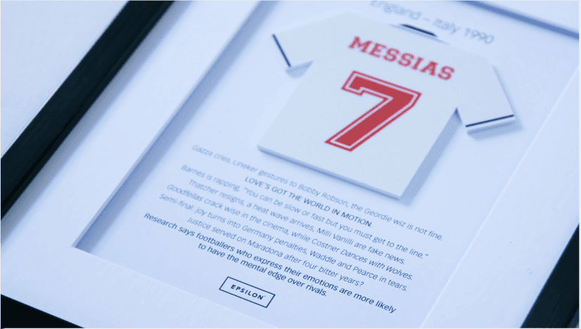 To do this, we gave each of the clients a memento to keep at their desk to take them back to those moments. A high-quality frame with a personalised football jersey, accompanied with copy that triggers collective emotions.