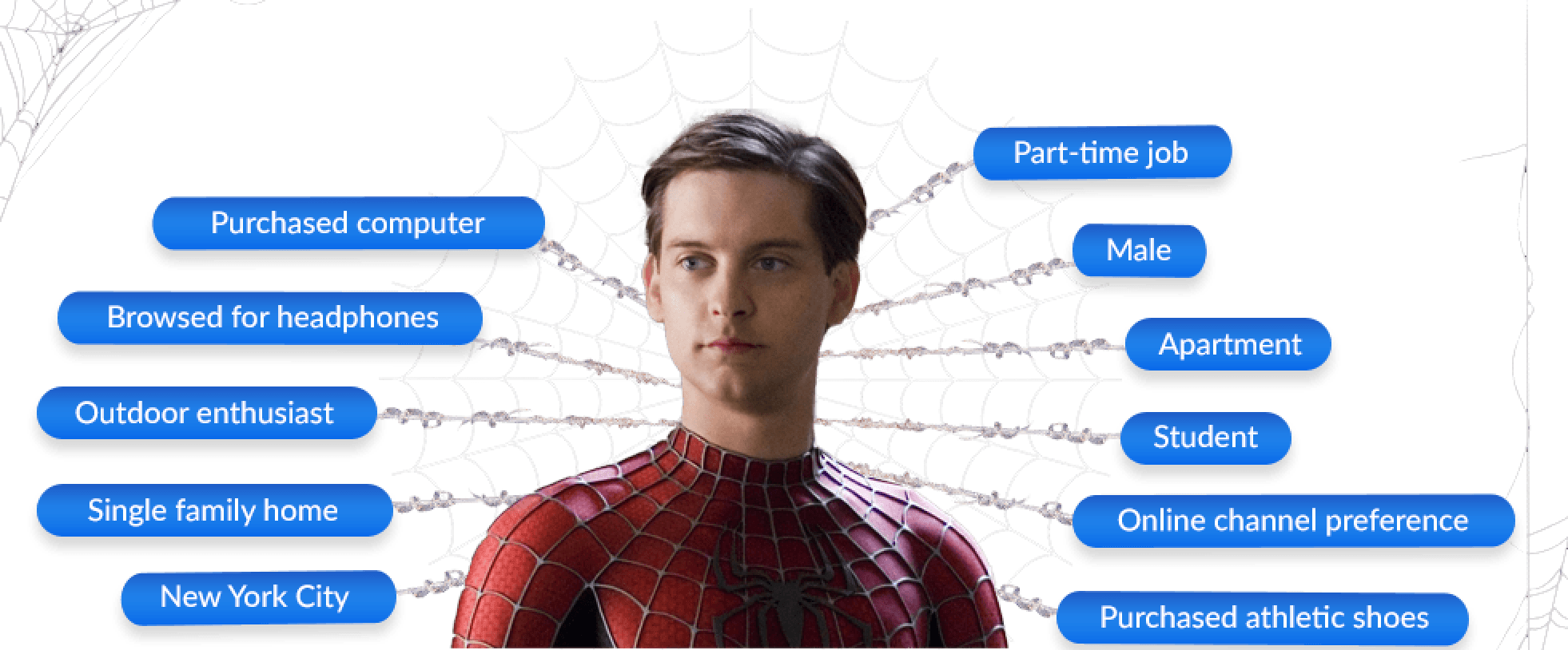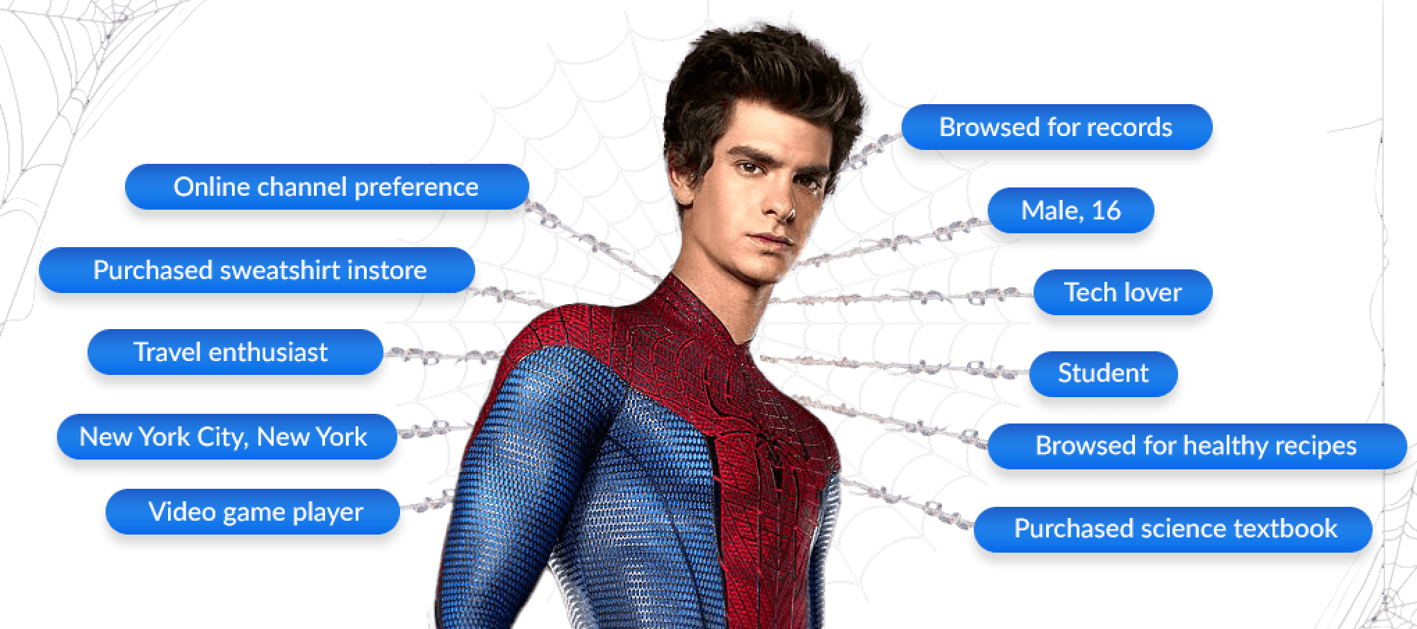 You may see the Friendly Neighborhood Spider-Man, portrayed by Tobey McGuire, as one person because he has an online channel preference, and you know he lives in New York City, and that he recently purchased athletic shoes.