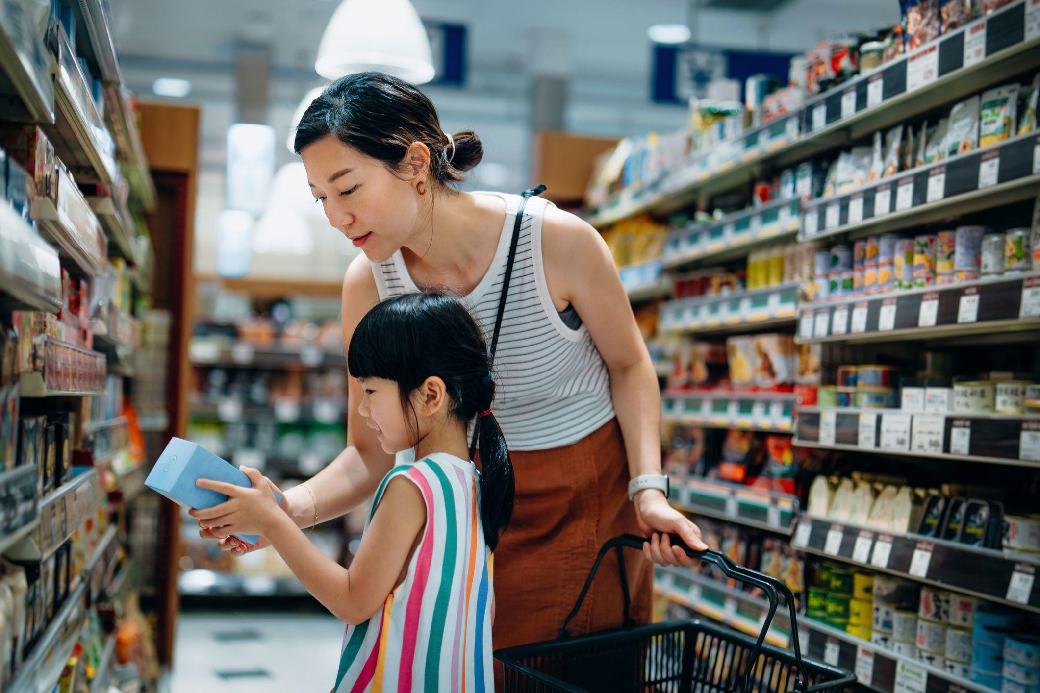 A cashier scans groceries at a supermarket checkout.