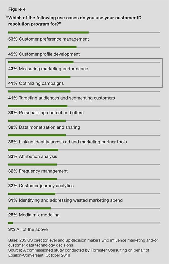 The Forrester research indicates that brands are more likely to use identity programs for things like customer preference management and profile development than for measuring online and offline performance or attribution.