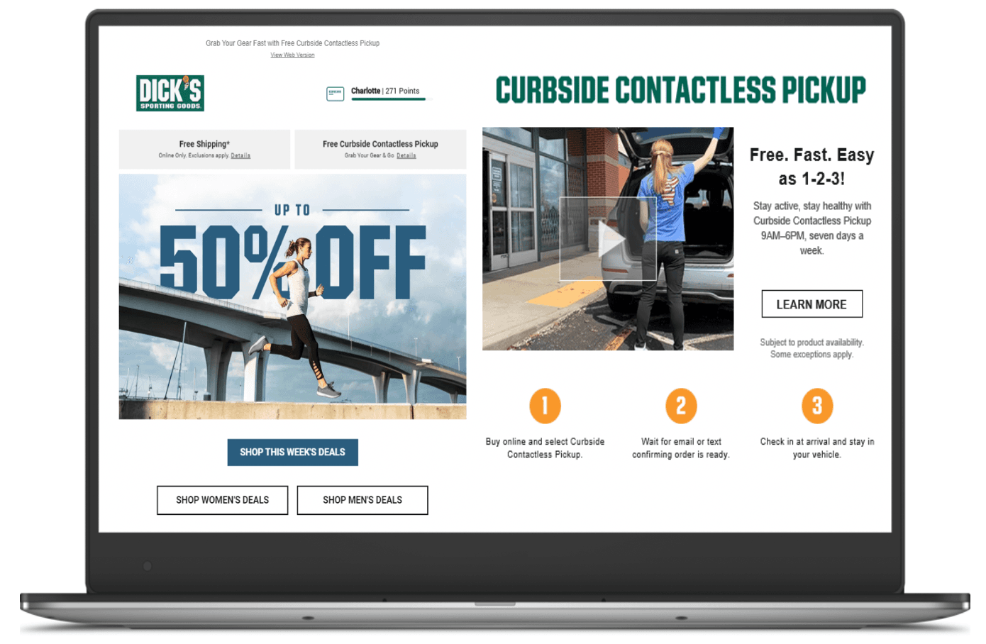 Dick’s Sporting Goods amped up their contactless curbside pickup service with a video showcasing PPE-wearing staff safely opening the trunk, placing in items and then the customer is good to go. Their healthy, stay-in-vehicle messaging reinforces deeper trend towards touch free efficiency and cleanliness. In addition, Dick's promotes high-need products with call-outs that inventory is re-stocking daily.