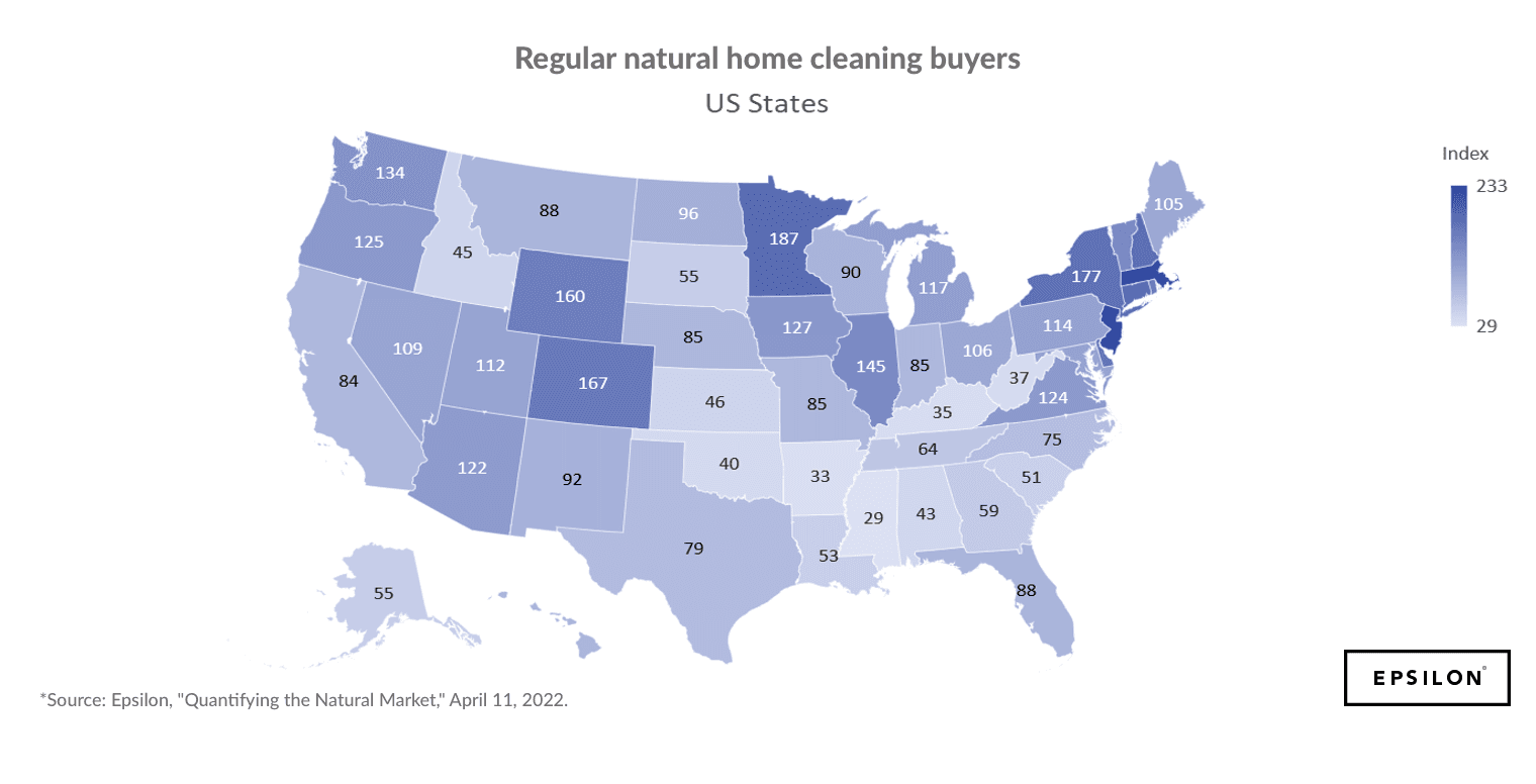 When looking at buyers’ potential to be green shoppers across the US, we see very few states that actually over-index for this group. The usual suspects show up, like California, Oregon, Washington and New York, but we also see states like Arizona, Nevada and Florida as areas with more than average green-product buyers.
