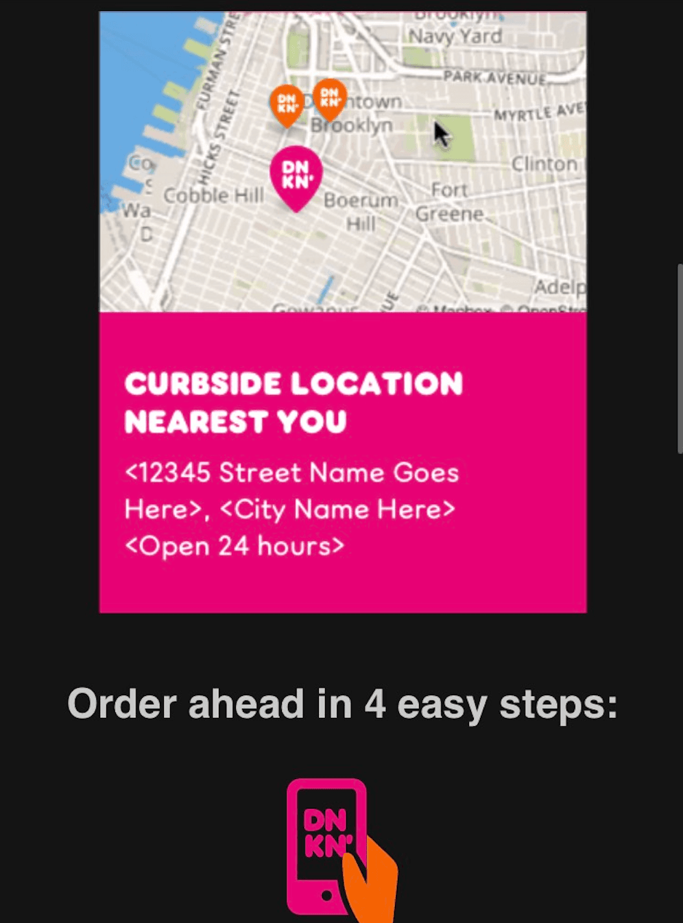 During the crisis, Dunkin’ wanted to encourage subscribers to order ahead and use their curbside pickup service. They rewarded customers with 50 bonus points every time they used this service on the Dunkin’ app. The interactive email design highlighted the four simple steps for ordering ahead and featured a live map that displayed each customer’s nearest Dunkin’ location and address at the time of open.