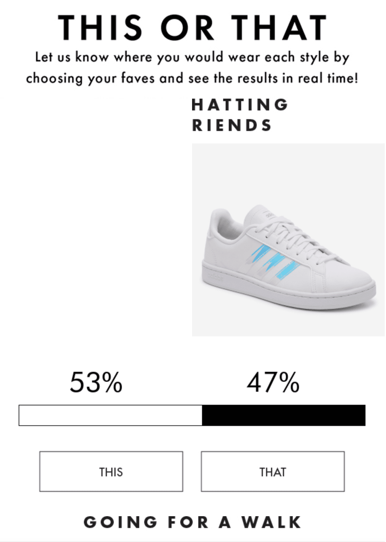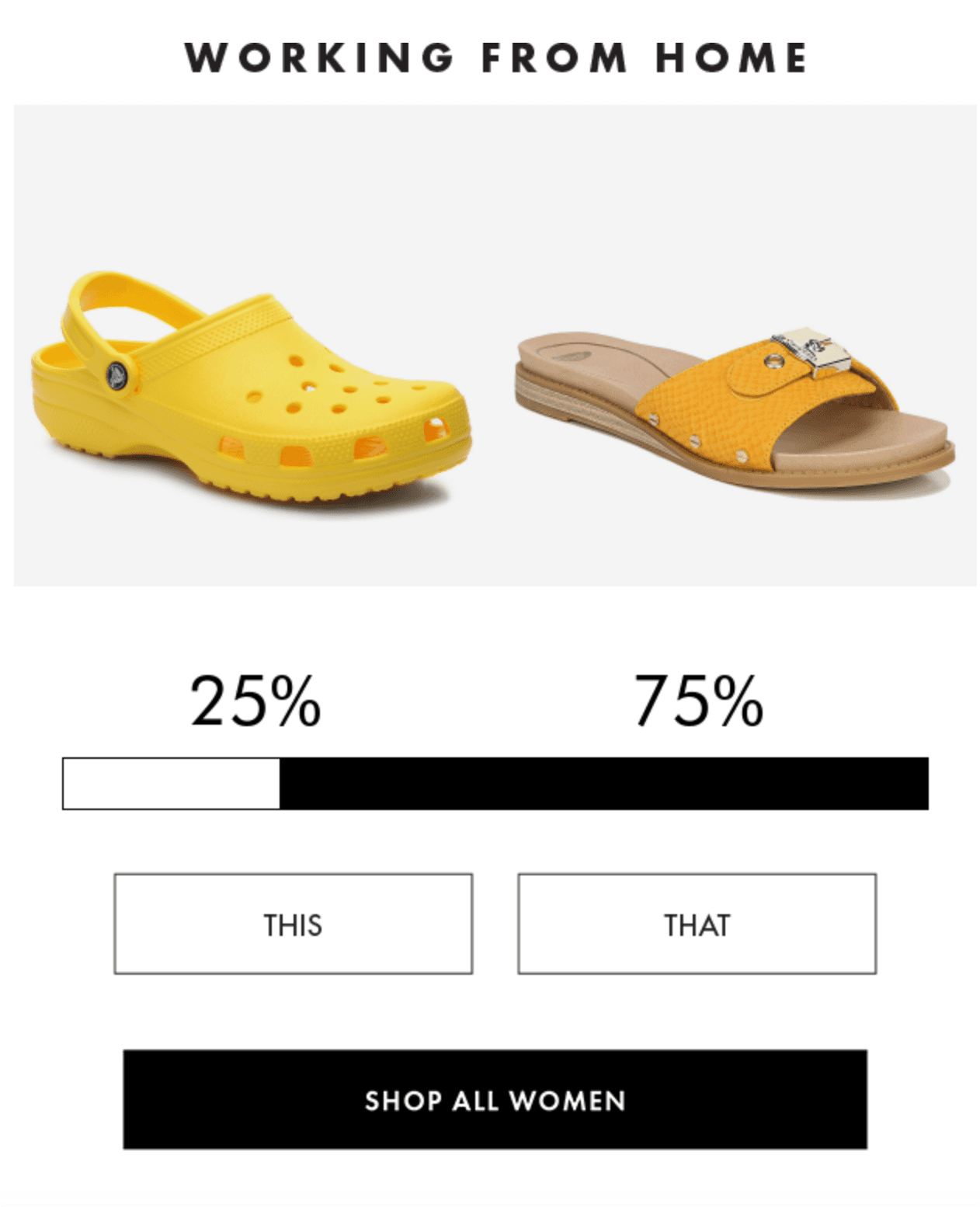 This highly engaging email design added an element of fun, as it asked subscribers to vote for the shoes they’d most like to wear for different COVID-19 “occasions”, like video chatting with friends, going for a walk or working from home. The interactive email featured a live poll, which displayed results in real time. The feedback from the poll could be used to personalize content in subsequent email campaigns by featuring the customer’s favorite shoes. Plus, to appeal to the many families who have been experiencing income challenges, it also offered savings on select styles.