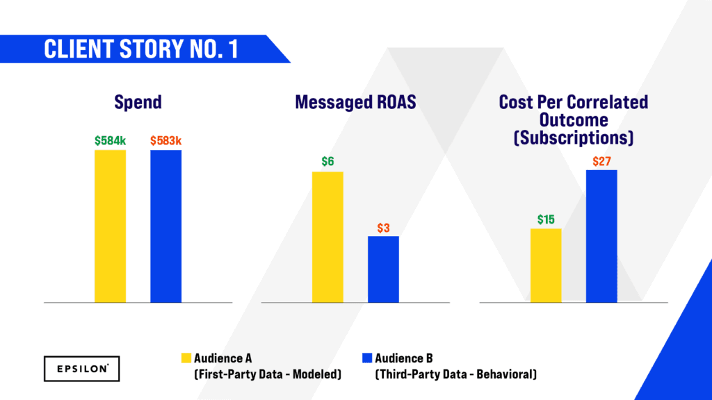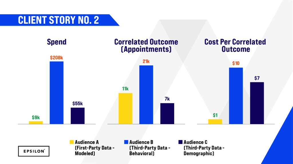 The cost per correlated outcome for audience A was $1, which is only 10-15% the cost of the other audience campaigns at $10 and $7.