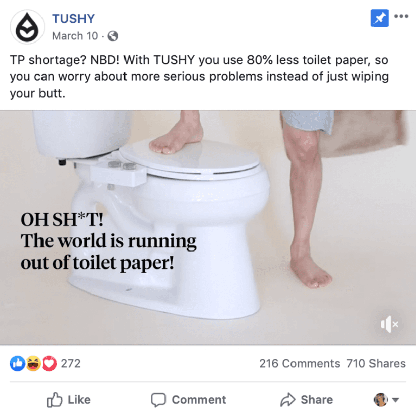 Smart brands are currently prioritizing the categories consumers need at home. And with that in mind, Tushy, the DTC maker of bidets, is perhaps the brand most perfectly poised to grow their business right now. While Americans haven’t always been fans of the bidet, that seems to be changing in the midst of the coronavirus-induced toilet paper shortages. Tushy has not been shy on calling out the consumer’s concerns with messaging like “OH SH*T! The world is running out of toilet paper!”
