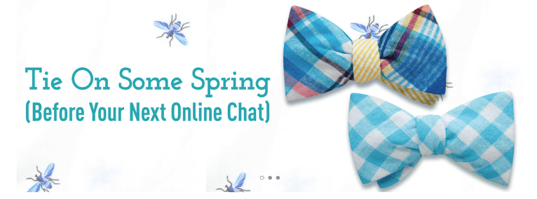 Beau Ties is also encouraging customers to buy with positive, bright spring colors and messaging, such as “Tie on some spring (before your next online chat).” This is a common approach we’re seeing in response to the COVID pandemic, as most people could use a little warmth and positivity.