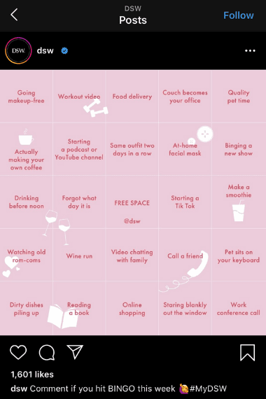 DSW put together a bingo board catered to quarantine life, in line with Instagram’s consumer posting increase in quarantine and college bingo boards. This is a great example of a brand considering audience media context and preferences.