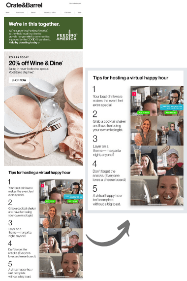 As well, Joann Fabrics created a template for making masks at home and promoted it via email. Crate & Barrel got creative with a five-step guide for better happy hours at home, offering something of value to shoppers to pair with the brand’s 20% off “Wine and Dine” deal, all within the same email.
