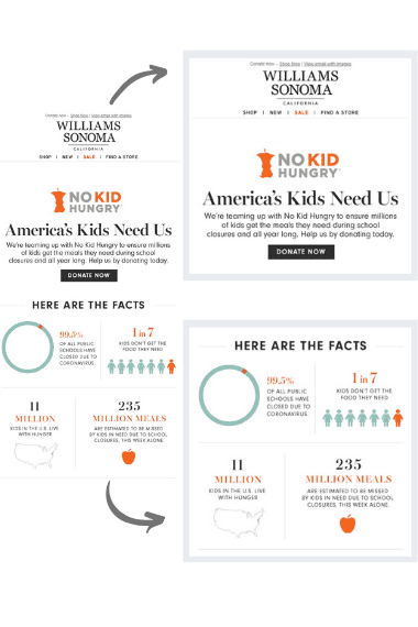 Williams Sonoma, for instance, teamed up with the non-for-profit No Hungry Kid to ensure kids out of school get the meals they need during this difficult time. Williams Sonoma highlighted this partnership in a recent email and offered readers not only the opportunity to donate, but also a few short infographics about how many kids are in need of food and how many meals are estimated to be missed.