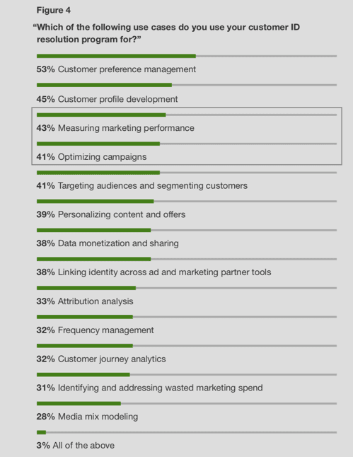 Generic campaigns like LTOs have become a crutch in the restaurant industry largely because they’re easy to both execute and measure—other types of campaigns can make it harder to prove a return on investment. Lots of brand marketers are falling into the same trap. Forrester found that only 43% of survey respondents use their identity program for measuring marketing performance—and 41% use identity for optimizing campaigns (see Figure 1 above). Decision makers told us they are more likely to use ID resolution for things like customer preference management and profile development than they are for driving measurement improvements or campaign optimization efforts.